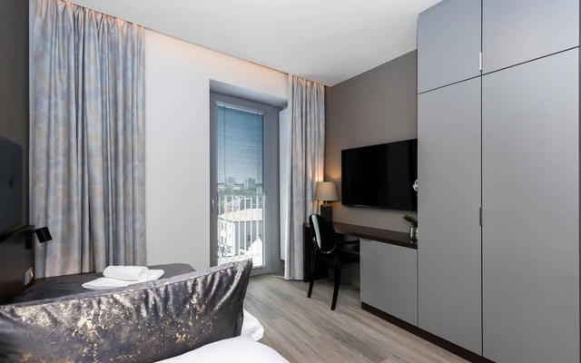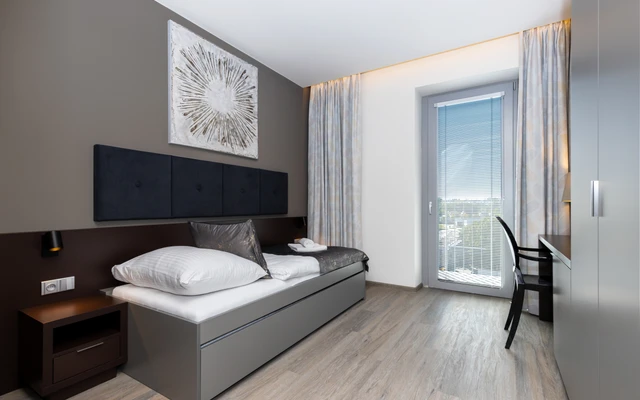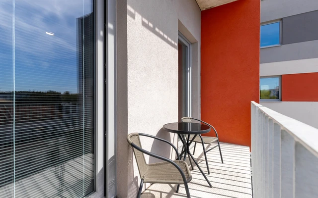 Komfortní postel (s možností přistýlky u jednolůžkových variant) je doplněna psacím stolem a židlí, což z pokoje dělá ideální místo nejen pro odpočinek, ale i práci. Moderní koupelna se sprchovým koutem a fénem zaručuje pohodlí po celý pobyt. Nechybí ani balkon s venkovním posezením, kde si můžete vychutnat chvíle klidu.