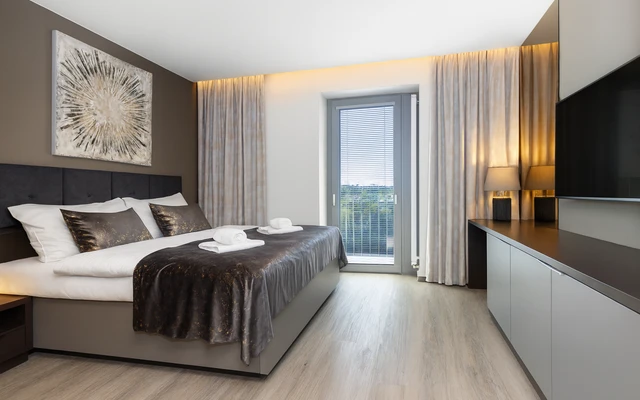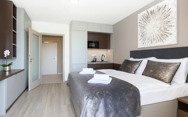 Dominantou pokoje je velká manželská postel s měkkými polštáři a zatemňovacími závěsy pro dokonalý odpočinek. Kuchyňský kout je plně vybaven nádobím, hrnci, sklenicemi a kávovarem, díky čemuž si snadno připravíte své oblíbené pokrmy. Pohodlné posezení na balkonu s výhledem doplňuje příjemnou atmosféru pokoje. Nechybí moderní koupelna se sprchou a elegantní vestavěné úložné prostory pro maximální pohodlí.