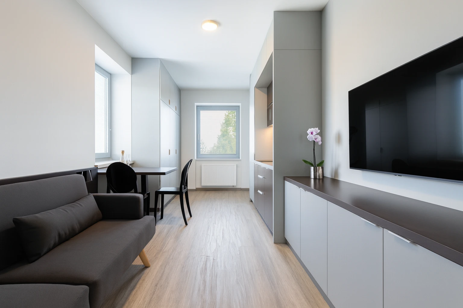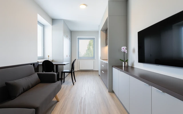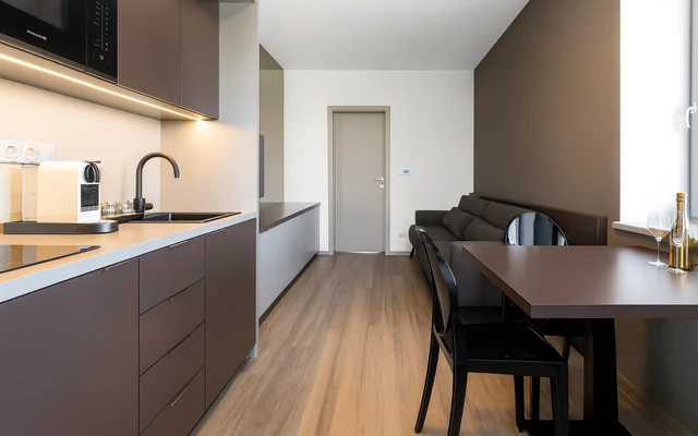 Tento elegantní apartmán nabízí kombinaci komfortu a moderního designu. Vstupní předsíň vede do jídelny propojené s plně vybavenou kuchyní, kde nechybí sklokeramická deska, vestavěná mikrovlnka ani kávovar. Pohodlná pohovka a 55" LCD televize zajistí dokonalou relaxaci.