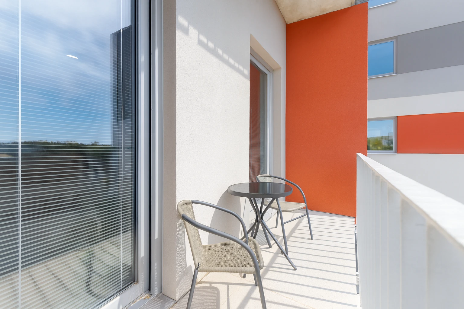 Ložnice je vybavena prostornou postelí, psacím stolem a židlí, přičemž přímý vstup na soukromý balkon s venkovním posezením poskytuje ideální místo k odpočinku.